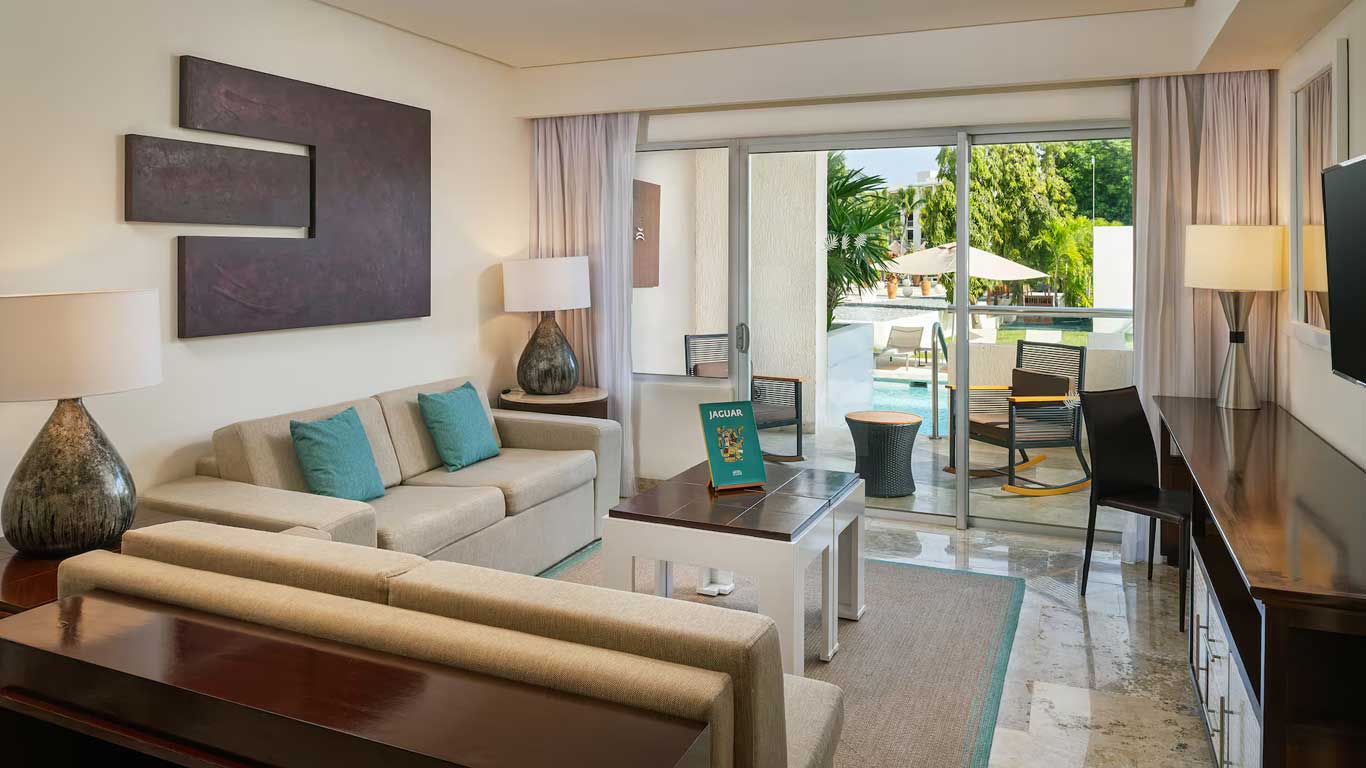 The Family Concierge Swim Up Master Suite at Paradisus Playa del Carmen features a sparkling pool right outside your terrace and all the Family Concierge privileges. A room comprising several spaces: a living room with two sofas, including a sofa bed, a dining room and a bedroom. All this plus a private terrace with hot tub.